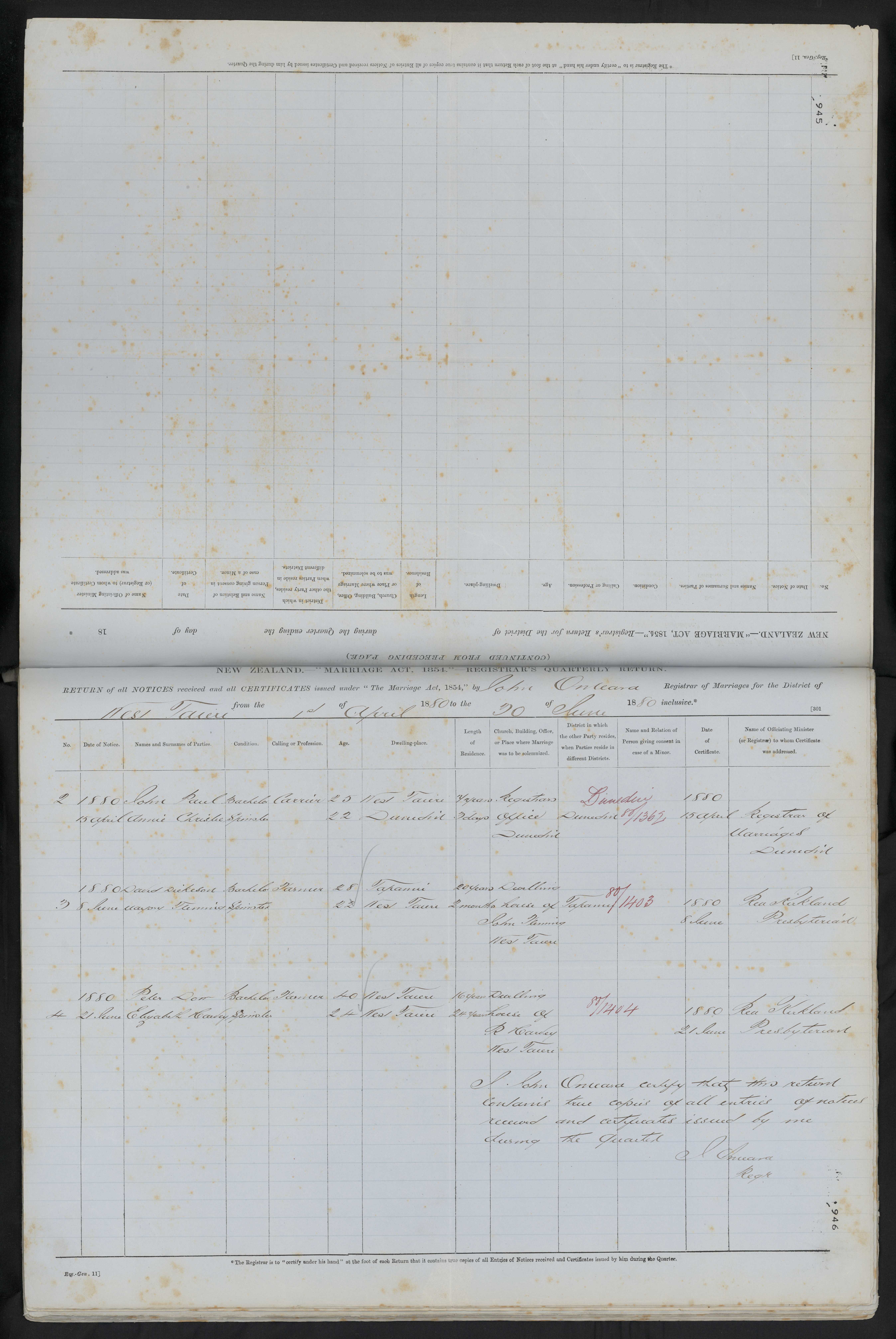 Registars Office Dunedin 80/1362 15 April 1880 Registrar of Marriages Dunedin