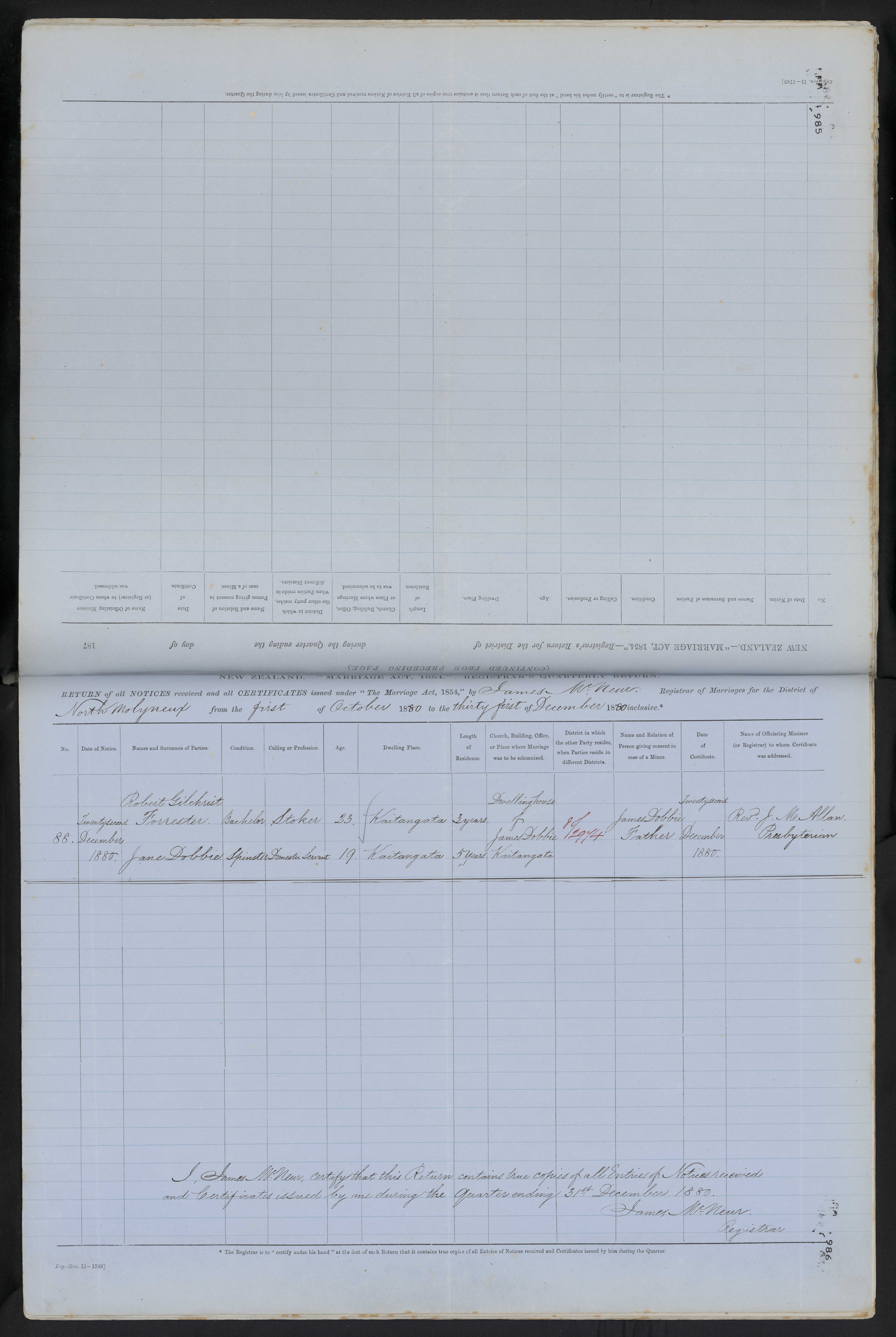 Dwelling house of James Dobbie 129/4 James Dobbie, Father 22 December 1880 Rev. J. Mc. Allan, Presbyterian