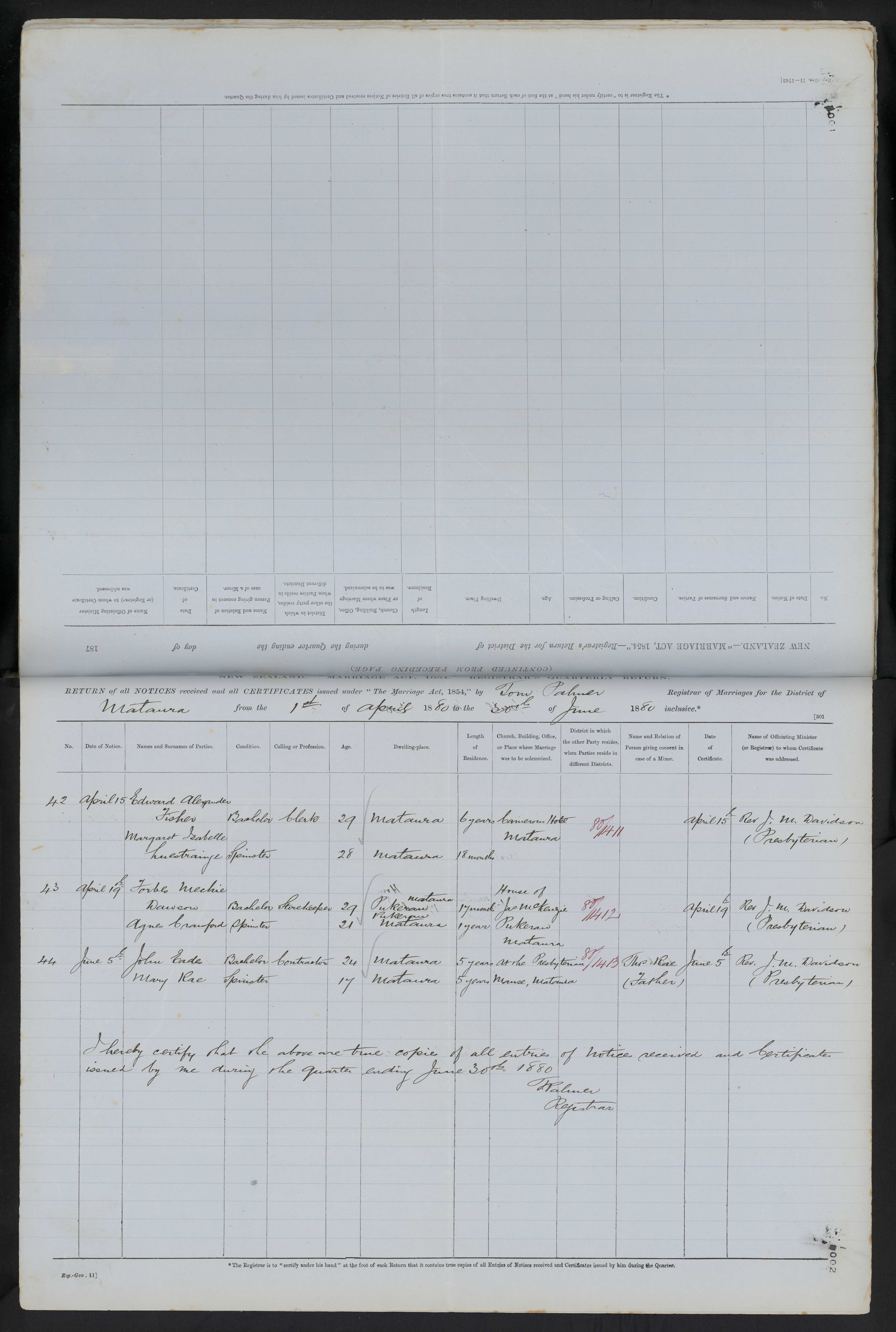 At the Presbyterian Manse, Mataura 80/143 Tho Rae (father) 5 June 1880 Rev. J.M. Davidson (Presbyterian)