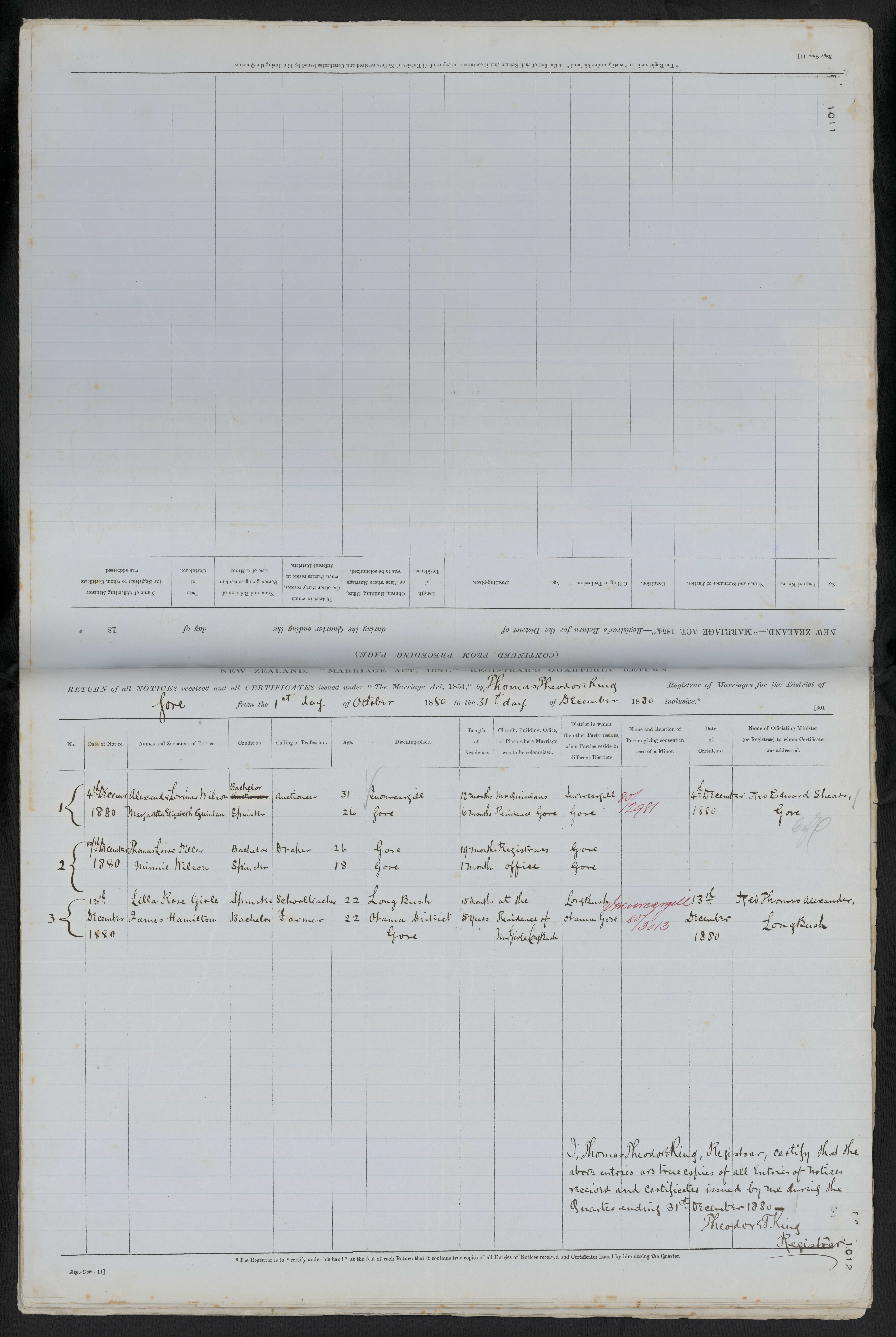 Mr Quinlans Residence Gore 80/1291 4 December 1880 Rev Edward Sheats Gore