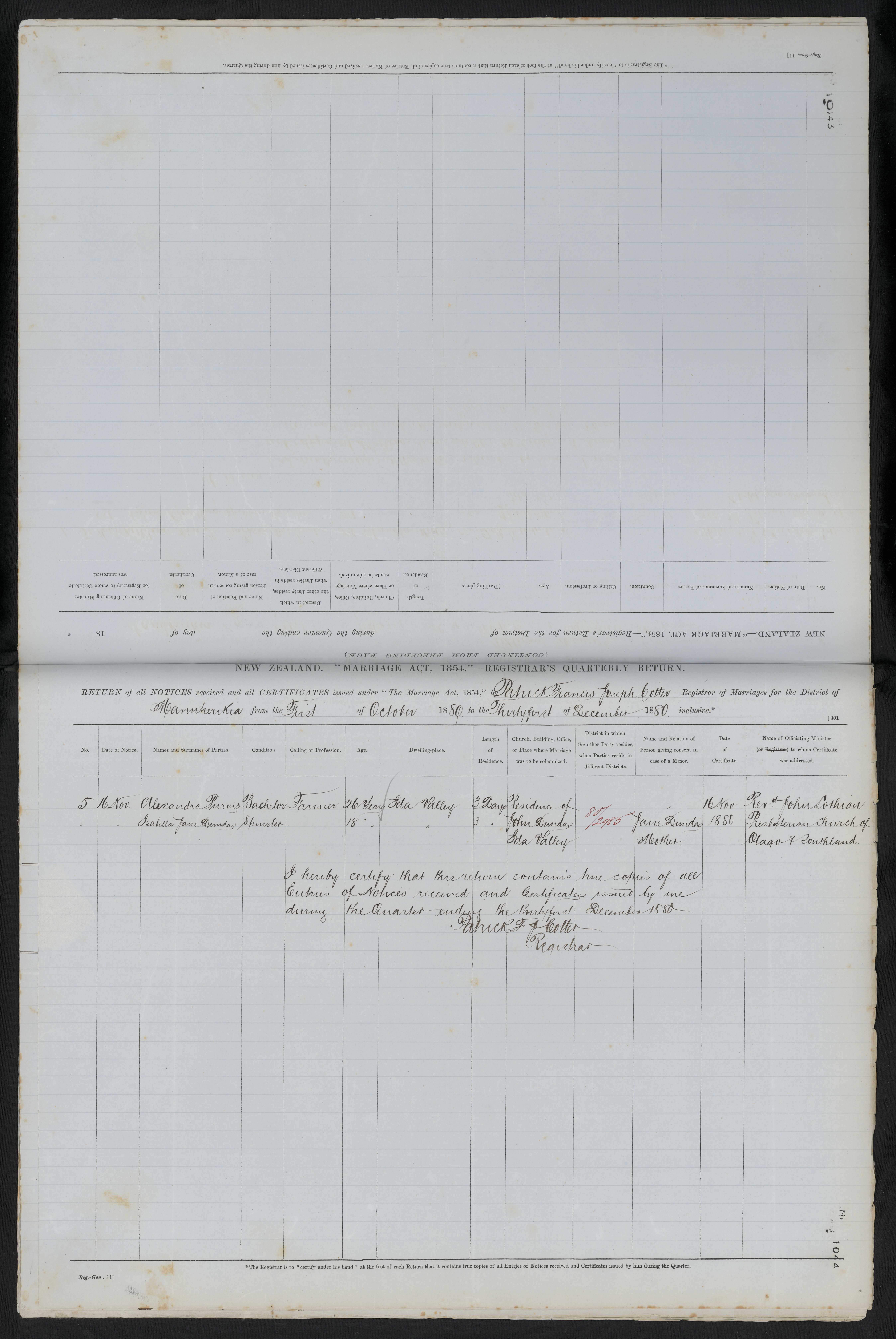Residence of John Dundas Ida Valley 80/2985 Jane Dundas Mother 16 November 1880 Rev. John Lothian Presbyterian Church of Otago & Southland.