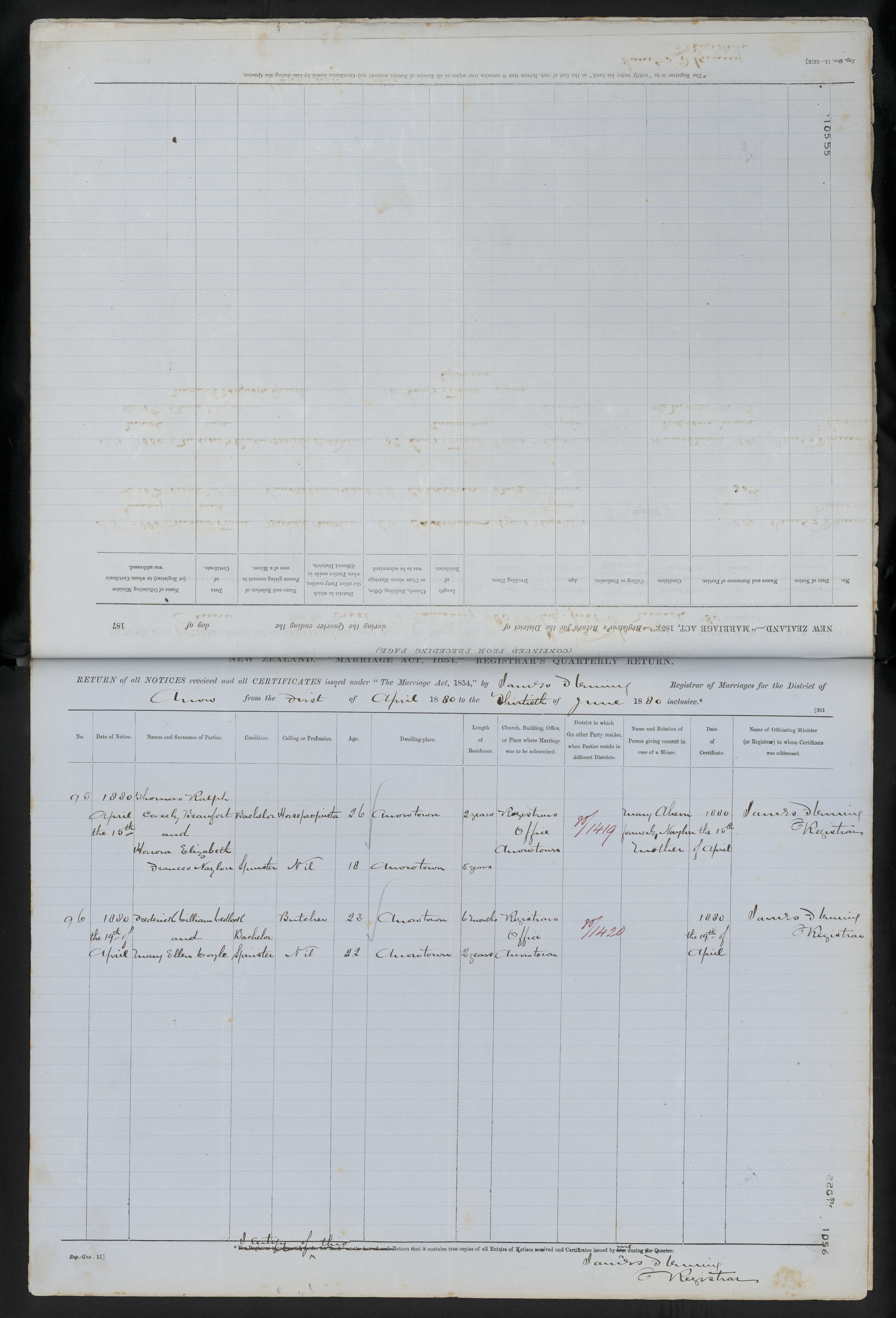Registrars Office Arrowtown 87/1420 19 April 1880 James Demming Registrar