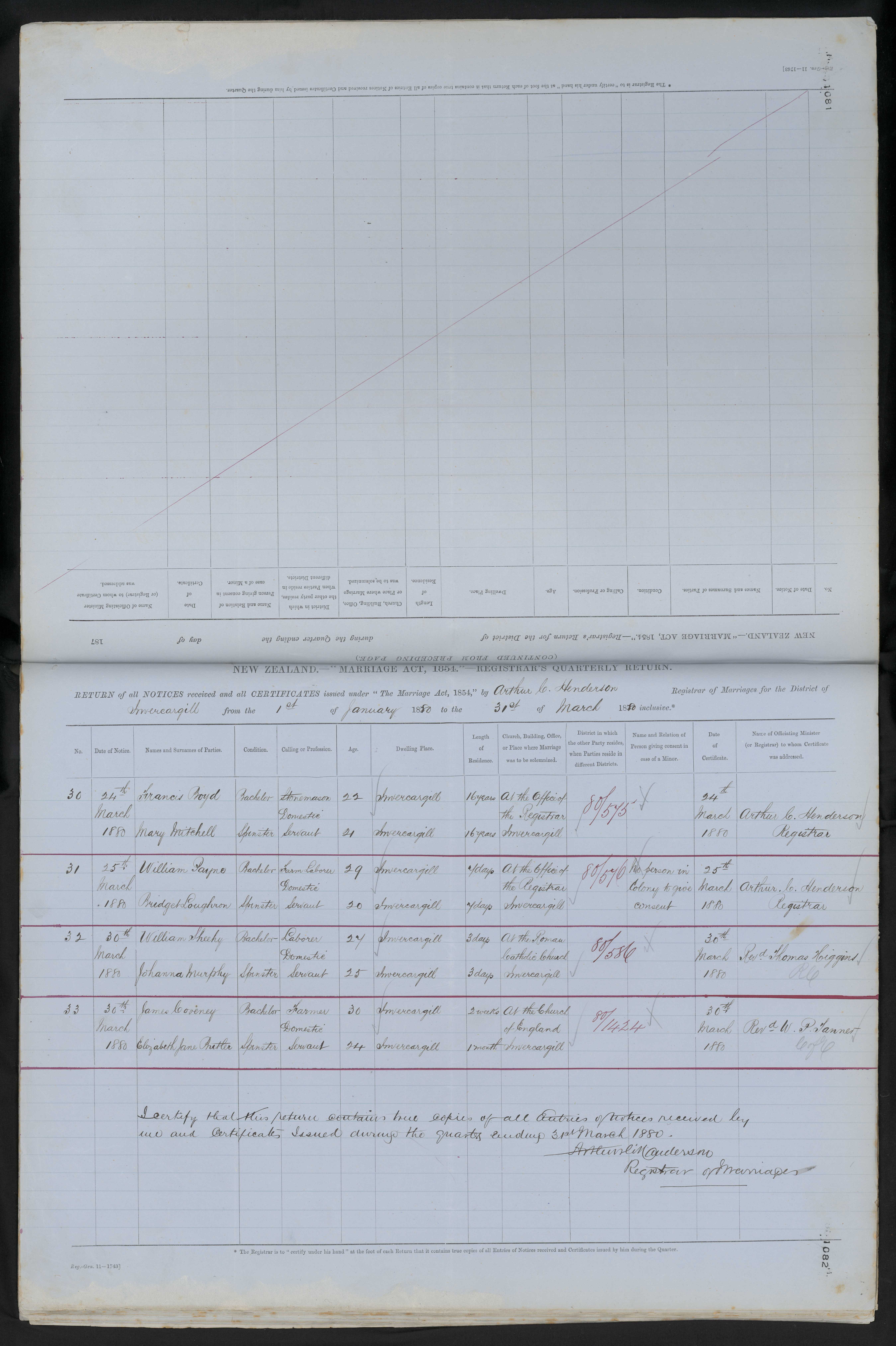 At the Office of the Registrar Invercargill 80/543 24 March 1880 Arthur lo. Henderson Registrar