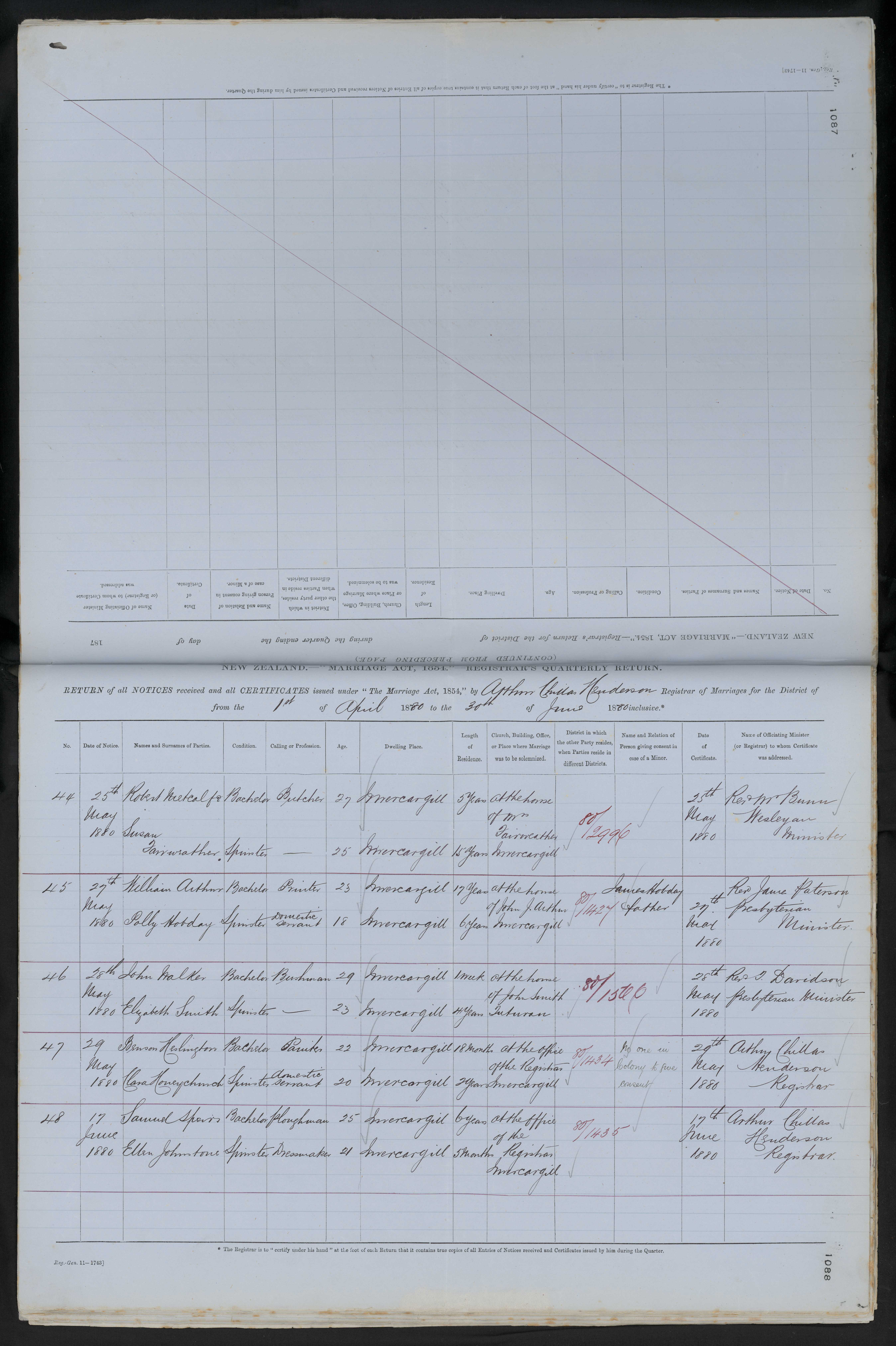 at the office of the Registrar, Invercargill | 80/1434 | No one in colony to give consent | 29 May 1880 | Arthur Chillas Henderson, Registrar | |||||||||||||||||||||||||||||||||||||||||||||||||||||||