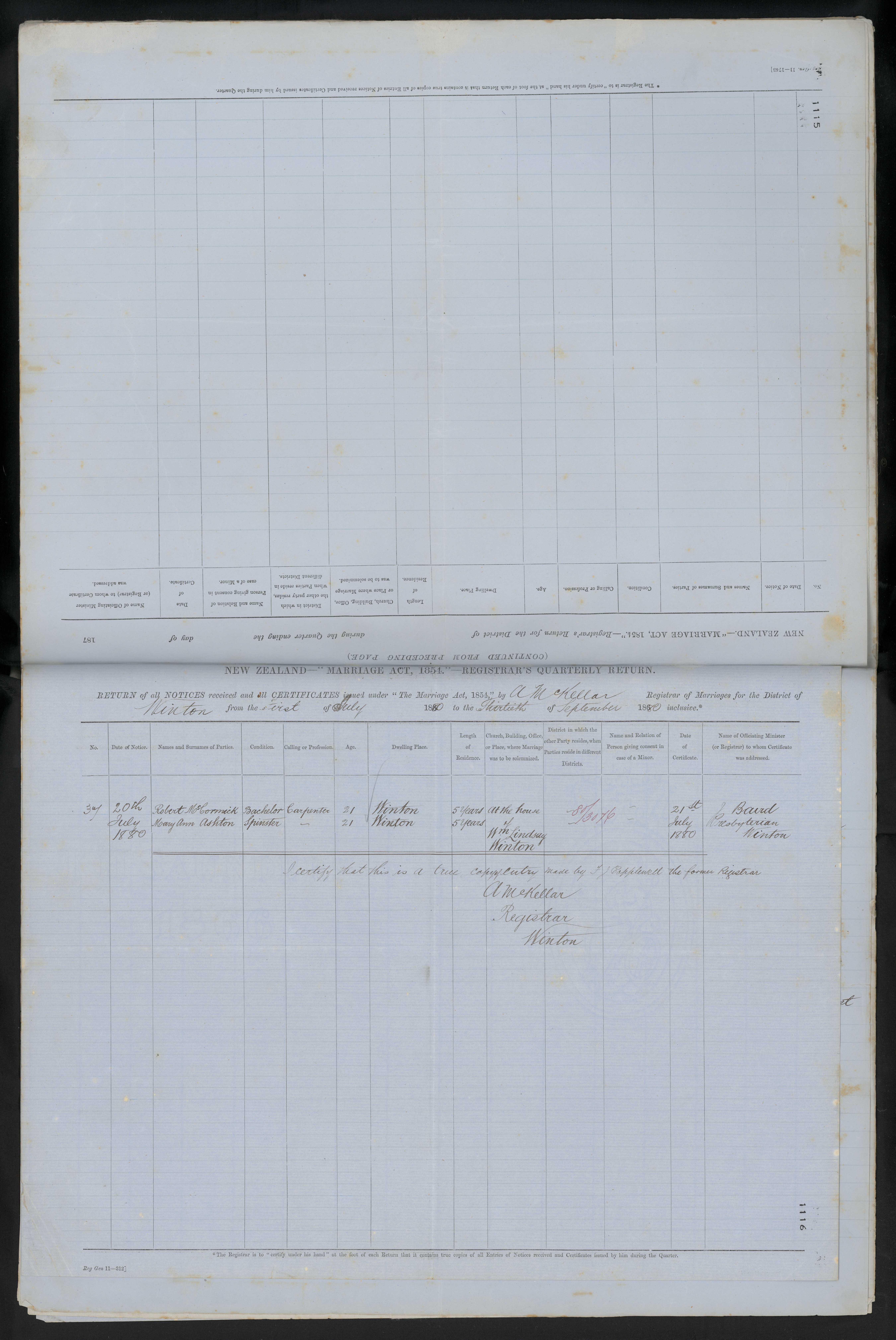 At the house of Wm Lindsay Winton 80/30/16 21 July 1880 J Baurd Presbyterian Winton